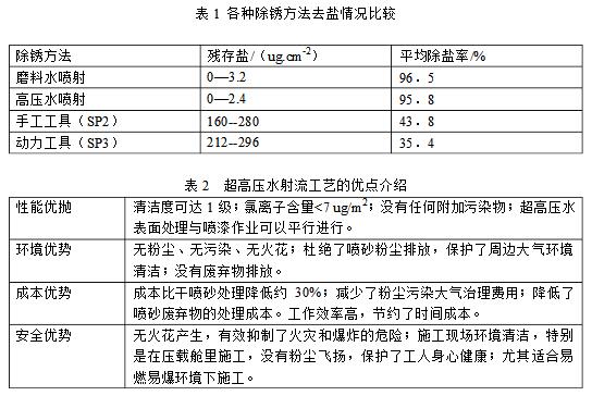 高压水射流除锈的原理是利用高压水射流的冲击作用(例如加上磨料就有磨削作用)和水撬作用破坏锈蚀和原有涂层对钢板的附着力。其特点是无粉尘污染,不损伤钢板,可以极大提高除锈效率(达15m2/h以上),除锈质量好。表1列出了不同除锈方法去盐的情况,表2是超高压水射流工艺的优点介绍。