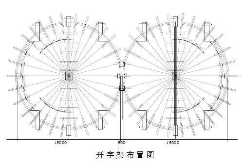 (4)按滑模平面布置图在基础环梁及底板上弹出各部位中心线、开字架位置、支承杆位置、模板位置等,以及设备垂直观测控制桩及标高控制点。本工程开字架布置图见下图: