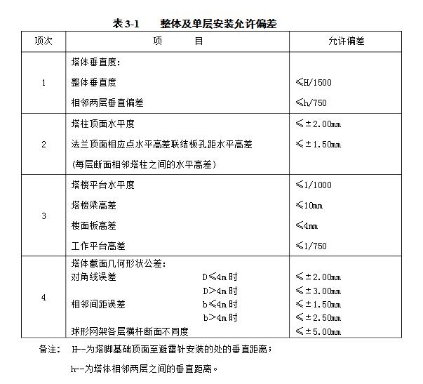 5.安装过程中,应随时核实其垂直度,架设完毕的塔体实际轴线与设计轴线偏差不大于塔体高度1/1500,局部弯曲不大于被测长度的1/750。