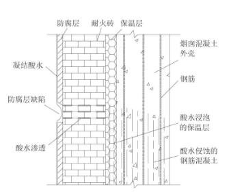 脱硫技改的老式混凝土烟囱,由于酸水和防腐层与外筒在空间上没有隔离,而是粘贴在耐火砖、保温层和混凝土壳体上,各种缺陷和漏点又难以避免,所以酸水直接从烟囱内表面泄漏到钢筋混凝土壳体内,造成结构危害。