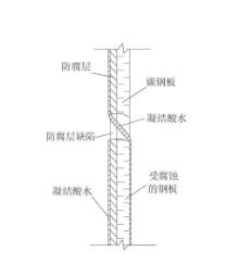 但是在钢筒内壁上的防腐衬里整体面积大,防腐蚀衬里的施工和维护同步涉及高空作业,周期长,人员多,危险系数高等因素,质量保证和避免缺陷的难度较大。比如砌筑类防腐衬里的勾缝数量庞大,钛合金类的防腐衬里的焊缝数量多,总焊接长度长,粘接类的防腐材料与钢体之间的热膨胀系数的差异,防腐衬里在钢筒内大面积的施工质量一致性等问题,都很容易造成防腐衬里的缺陷。酸水和防腐衬里在空间上与钢板没有隔离,从而导致酸水泄漏流淌到钢筒筒体上。